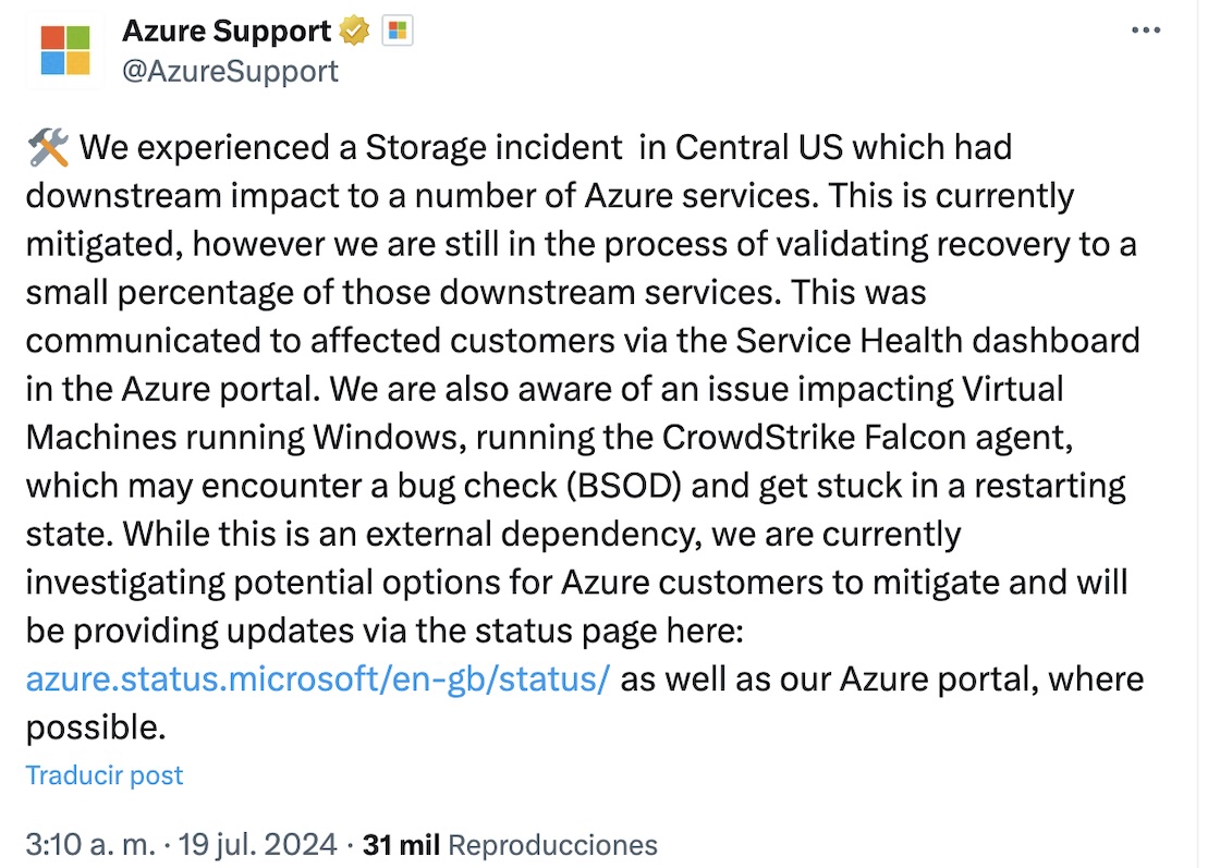 Peeeeero tras esta actualización en falso en el Falcon, que no fue reconocida por Microsoft Azure, comenzaron a aparecer las fallas en las computadoras y sistemas de decenas de compañías que usan este software y… el resto fue historia: